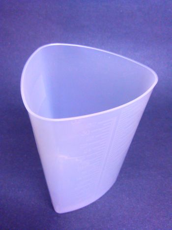 - Plastic beaker used to measure liquids and powders. The graduates are labeled in mL and ounces for intake or output accurately. Triangular shape allows for ease of measuring, visualization of contents, and pouring.